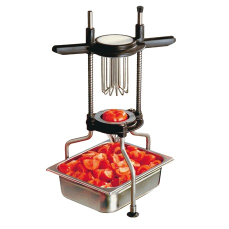 Juego de cuchillas y empujadores intercambiables. Centrado de la fruta para lograr un corte uniforme. Buen agarre a la superficie de trabajo, garantizado por 3 ventosas. La seguridad es total porque no hay contacto posible con las cuchillas. Espacio entre patas que permite el uso de una bandeja gastro GN1/2
